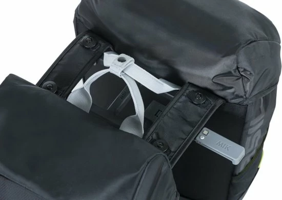 De Basil Miles Double bag is een waterdichte dubbele fietstas met een inhoud van maar liefst 34 liter. Aan de zijkanten van de tas bevinden zich nog twee extra elastische vakken. Handig voor het vervoeren van een flesje drinken of een paraplu. De tas is daarmee ideaal voor het vervoeren van boodschappen of voor een recreatieve fietstocht. Mocht het plots gaan regenen, dan blijven je spullen droog. De tas is namelijk waterdicht en is voorzien van een roltopsluiting. Zo komt er geen druppel bij de inhoud van je tas. Wil je meer weten over wat deze tas waterdicht maakt? Kijk dan hier. De reflecterende details op de tas maken dat je beter zichtbaar bent voor andere verkeersdeelnemers. Daarnaast kun je extra LED-verlichting aan je tas hangen. De dubbele fietstas beschikt namelijk over verschillende lusjes voor LED-verlichting. De dubbele fietstas heeft een voorgemonteerde MIK Adapterplaat (70171). Hierdoor maak je van je dubbele tas een afneembare tas. Je klikt de adapterplaat namelijk in een MIK systeemdrager of als je deze niet hebt een MIK Carrierplaat (apart verkrijgbaar). Het gebruik is heel eenvoudig! Je klikt de tas erop en met hetzelfde gemak klik je de tas er ook weer af. Eigenschappen: Met een inhoud van maar liefst 34L kun je veel kwijt in de Basil Miles Double Bag MIK. De extra reflecterende delen en de mogelijkheid om LED verlichting op deze tas aan te brengen maken fietsen in het donker veiliger. Inclusief MIK-stick en voorgemonteerde MIK Adapterplaat Geschikt voor MIK systeemdragers of een MIK Carrierplaat (apart verkrijgbaar).