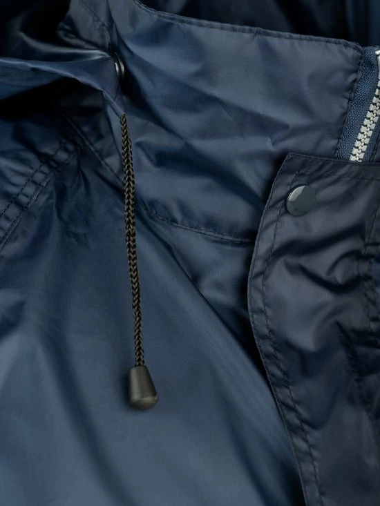 De rits van de regenjas is verdekt met een beschermende flap met drukknopen. De capuchon is afritsbaar en verstelbaar met een koord. Ook de taille boord is verstelbaar met een elastisch koord. De mouwen hebben elastische manchetten. De jas heeft twee heupzakken met knoopsluiting. Het is een ruime fit waardoor de jas goed over kleding is te dragen. De regenjas is voorzien van reflectie op de borst en rug voor extra zichtbaarheid in het donker.