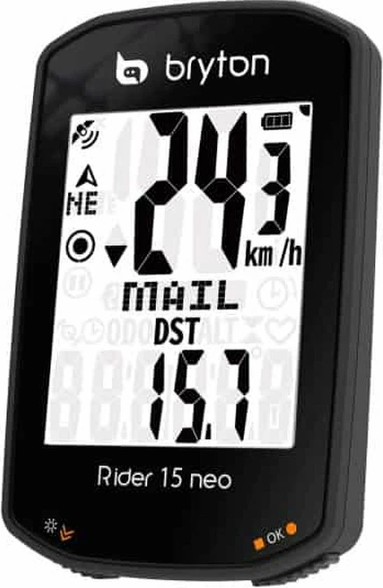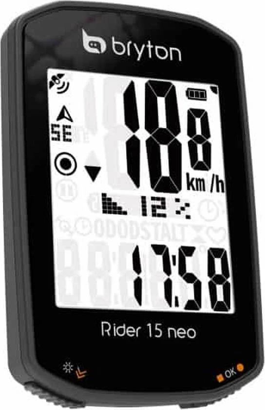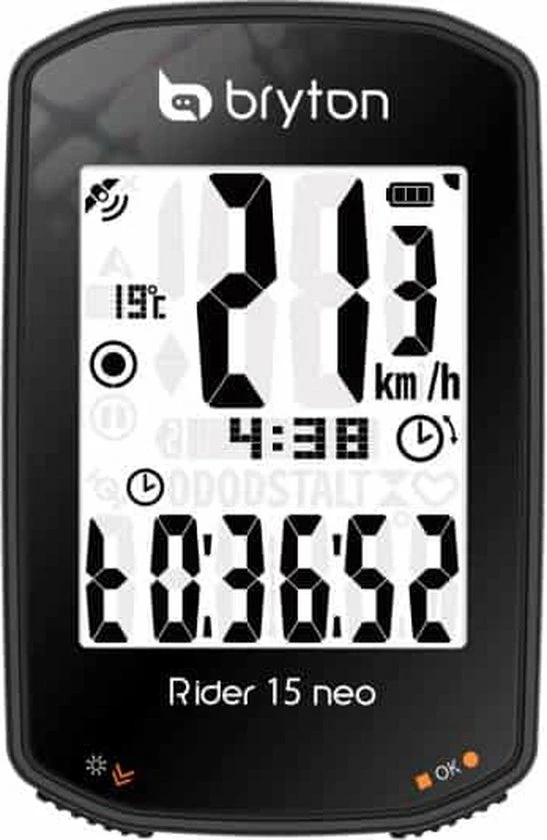De Rider 15 neo is uitgerust met een duidelijk 2 scherm en 3 gebruiksvriendelijke knoppen, maar ook met verbeterde software, meer dan 21 functies en een oriรซntatiemodus die de richting waarin de fietser gaat, aangeeft. Met een groot 2 display geeft de Rider 15 neo u nog een duidelijker zicht op de snelheidsgegevens op het vergrote gegevensraster. Het hoogwaardige optisch gebonden display biedt kristalheldere uitlezing zonder interferentie storing vanuit elke hoek en omgeving. Met de ondersteuning van het GNSS-systeem (Global Navigation Satellite System), biedt de Rider 15 neo een grotere dekking en behendigheid en elk type geografie, ook bij substantiรซle bedekking van bomen en gebouwen, of in de bergen. Bovendien krijgt u ook een grotere variรซteit van regio’s door de integratie van satellieten zoals GPS (VSA), Galileo (EUR) en QZSS (Japan). De Rider 15 neo is uitgerust met een krachtige batterij met een gebruiksduur van 16 uur en ondersteuning voor onderweg opladen met een powerbank. De Rider 15 neo helpt u om elke afstand of piek aan te pakken! Met maar liefst 21 functies ondersteunt dit apparaat uitgebreide gegevens voor het nauwgezet meten van de prestaties van elke rit die u kunt bekijken in de analyse na de training via de Bryton Active companion App (beschikbaar voor iOS en Android). De Rider 15 neo integreert ook BLE-snelheids-, cadans- en hartslagsensoren, inclusief sensoren van derden na probleemloos koppelen. Bekijk telefoonmeldingen, inclusief oproepen, teksten en e-mails, direct op de Rider 15 neo na een gemakkelijke instelling met de Bryton Active App via BLE (beschikbaar voor iOS en Android). Deze krachtige functie helpt om van de Rider 15 neo de definitieve slimme fietsgezel voor elke Bryton-gebruiker te maken. ’s Avonds rijden is nu nog nauwkeuriger geworden! De Rider 15 neo heeft een scherm met een hoog contrast, uitgerust met een krachtige ingebouwde achtergrondverlichting waardoor u het helder kunt laten oplichten wanneer u rijdt in schemerige gebieden of voor comfortabel rijden ’s avonds. Daarnaast kan dit apparaat worden gecombineerd en aangepast met alle fietsaccessoires en zal geen storingen ondervinden van andere aangesloten apparaten of LED-lampen. Maak uw gegevensweergave op maat met de Bryton Active App! Na het koppelen met de Bryton-app kunt u de velden/pagina’s met gegevens op maat maken gebaseerd op uw trainingsdoelen via BLE op uw telefoon. Dat werkt supergemakkelijk. Geniet van de draadloze synchronisatie met de nieuwe Bryton Active App. Jouw trainingsgegevens kunnen automatisch via Bluetooth van de fietscomputer naar de Bryton Active App worden gesynchroniseerd, vanuit waar je de vooruitgang en grafische analyses kunt bekijken en ritten op social media kunt delen. In de app kunnen gebruikers de fietscomputer synchroniseren en aanpassen, routes downloaden, de netwerkinstellingen aanpassen en de hoogte kalibreren zonder internetverbinding op het GPS toestel. De app controleert ook de firmwareversie en GPS-gegevens van de fietscomputer en laat het gebruikers weten wanneer er updates beschikbaar zijn, zodat de meest recente firmware altijd is geรฏnstalleerd. Met een eenvoudige koppeling kunnen STRAVA, TrainingPeaks en Selfloops automatisch synchroniseren zodat jij je activiteiten kunt delen vergelijken met miljoenen anderen. Ga de strijd aan met rijders over de hele wereld via de opgenomen gegevens van de Rider 15 neo. Er is geen software nodig om bestanden te converteren. Workout-bestanden worden automatisch opgeslagen in de FIT indeling, die kan worden geupload naar populaire training sites. We maken het ook supereenvoudig voor u om uw activiteiten te synchroniseren vanaf de Bryton Active App naar Strava/TrainingPeaks/Selfloops door uw accounts te koppelen.
