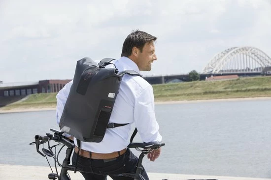 Voorkom natte spullen met deze waterdichte fietstas. Deze handige rugzak is snel afneembaar en biedt veel ruimte om spullen mee te nemen.
