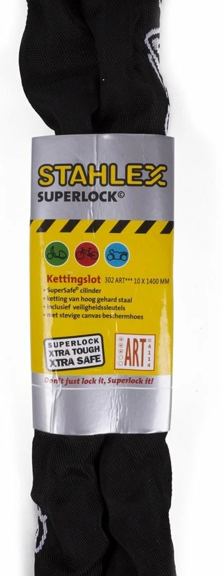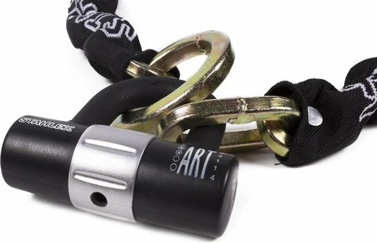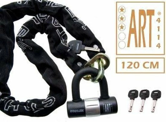 Over het algemeen verlangen verzekeringsmaatschappijen deze categorie voor de beveiliging van brom- of snorfiets of scooter. De afmeting is 10 mm x 120 cm en het gewicht bedraagt 3,4 kg. Het toelatingsnummer van ART is MBT 4114. Er zitten bij dit slot 3 sleutels. Specificaties: