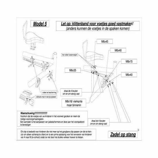 Zadel op Stang nummer 5 is speciaal ontwikkeld voor herenfietsen met oversized (aluminium of stalen) frame. Heeft uw herenfiets twee stangen van normale grootte? Dan heeft u zadel op stang model 2 nodig. Deze is ook te vinden op bol.com. Dit alternatieve fietszitje met stalen voeten- en ruggensteun is gemaakt voor een bovengemiddeld dikke onderbuis van maximaal 78 millimeter (en een bovenbuis van maximaal 46 millimeter).